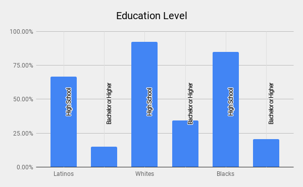 El latino es el grupo étnico menos educado. De acuerdo con el censo, solamente el 66.7% tiene certificado de educación media superior mientras que sólo el 15.2% tiene una licenciatura o un nivel superior. Para la población blanca estos mismos conteos son de 92.3% y 34.5%, para la comunidad negra son 84.9% y 20.6%, para nativo americanas 79.7% y 14.3%, para nativo hawaianas y de las islas del pacífico son 86.9% y 16.9% y para asiáticas 86.5% y 52.7%.