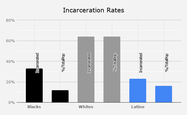 En términos de encarcelamiento, la población negra (que constituye un 12% de la población nacional) representa el 33% de la población carcelaria, las personas blancas (64% de la población) constituye el 30% y las y los latinos (16% de la población) hacen el 23% de la población carcelaria en EE.UU. Las personas blancas y latinas están sobrerrepresentadas mientras que las blancas están subrepresentadas.