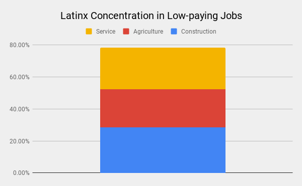 En términos de empleo, las personas latinas están sobrerrepresentadas en industrias con bajos salarios y poco representadas en las industrias con mayor paga. La población latina representa el 28.5% de los empleos en la construcción, 23.9% de los trabajos en la agricultura y 26% de los trabajos en servicios (comparado con el 17% que ocupa la población blanca). De acuerdo con un reporte del congreso de 2016 titulado “El estado económico de la comunidad latina en América”, “muy pocos hispanos e hispanas trabajan en empleos típicamente bien pagados, incluyendo empleos en computación y matemáticas, y empleos en arquitectura e ingeniería, los cuales sólo emplean alrededor del 1% de trabajadores de la población latina”. La ocupación más común para mujeres latinas es en restaurantes (10.3%), mientras que para los hombres latinos es la construcción (17%).