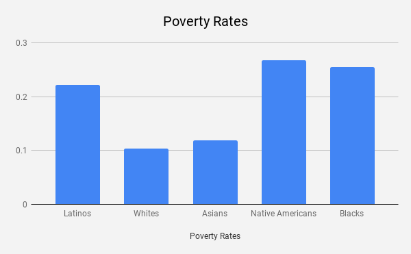 De acuerdo con el censo de 2010, 22.2% de personas latinas viven en la pobreza, en comparación con el 10.3% de personas blancas, 11.9% de asiática, 26.8% de nativas americanas y 25.5% de personas negras. Entre las latinas, las mexicanas tienen un índice de pobreza de 24.9%, comparado con un 18.9% para salvadoreñas, 16.2% para cubanas, 24.9% para guatemaltecas y 25.6% para puertorriqueñas, por nombrar algunos de los subgrupos latinos.